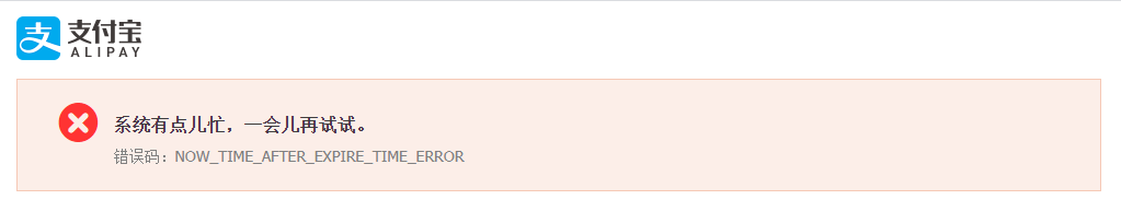 网站pc扫码支付报错 系统有点儿忙,一会儿再试试。错误码:NOW_TIME_AFTER_EXPIRE_TIME_ERROR。